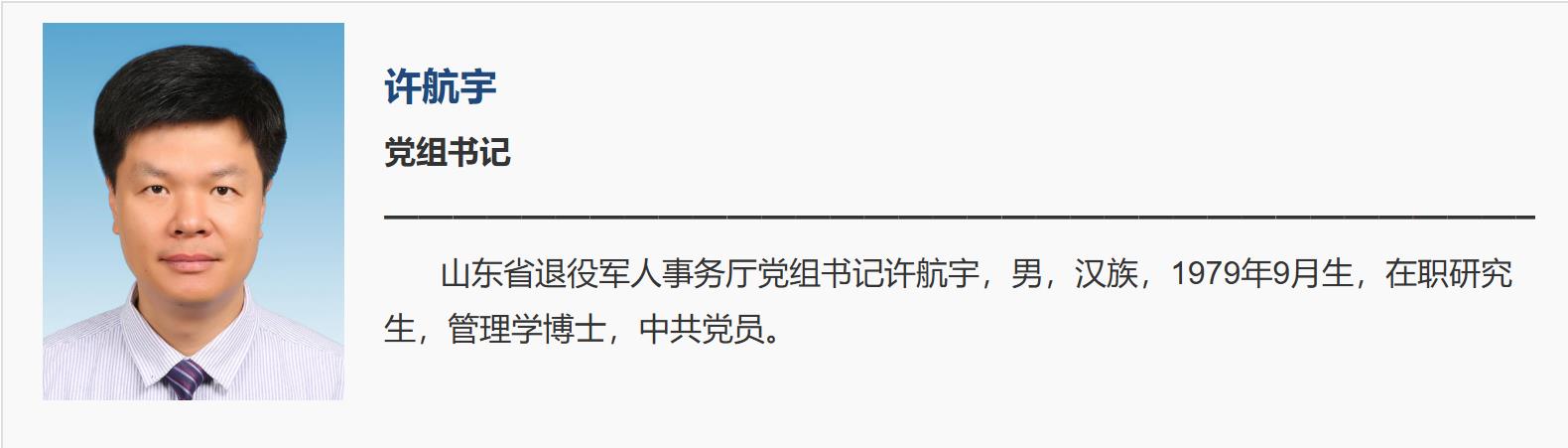 山东省退役军人事务厅网站“领导信息”栏目更新显示,许航宇已任山东省退役军人事务厅党组书记。